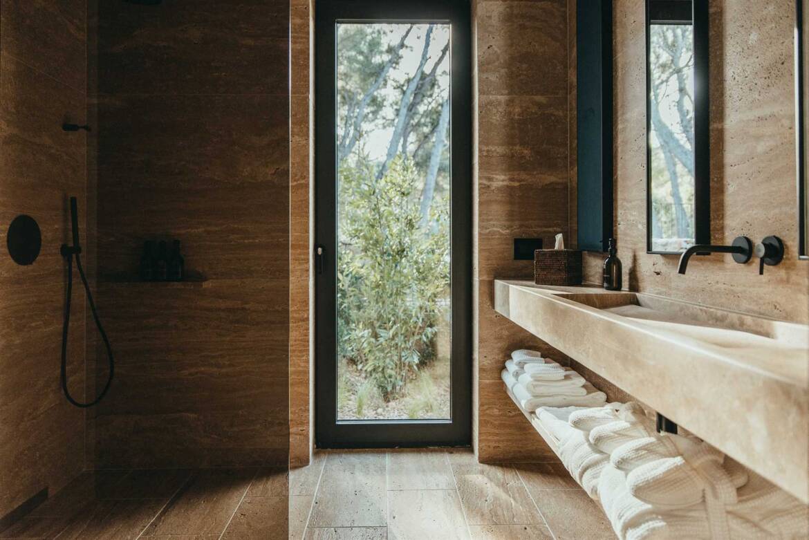 A spacious outdoor wooden terrace features a private infinity heated 50 m2 swimming pool, an outdoor living area with a Jacuzzi, barbecue, and outdoor dining area with a dining table and outdoor shower, all surrounded by pine forest, sea, and a sky