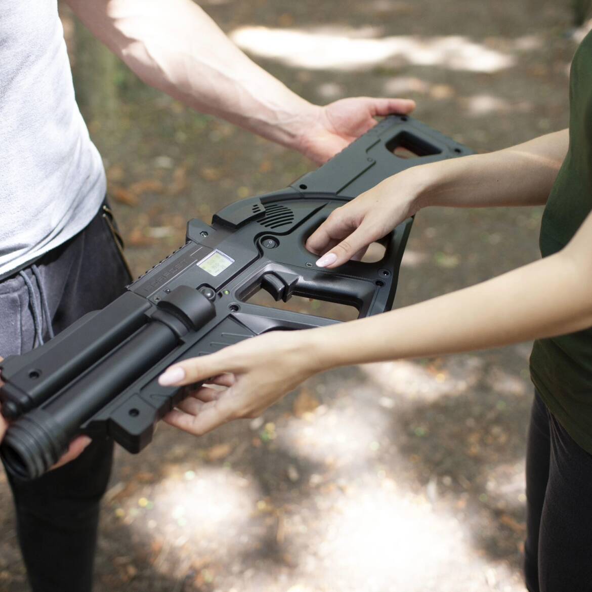 Forget paintball and airsoft – no bruises, no mess. This is 100% safe, clean fun with pro-level equipment that hits targets up to 200 meters away. Yes, really – 200 meters!